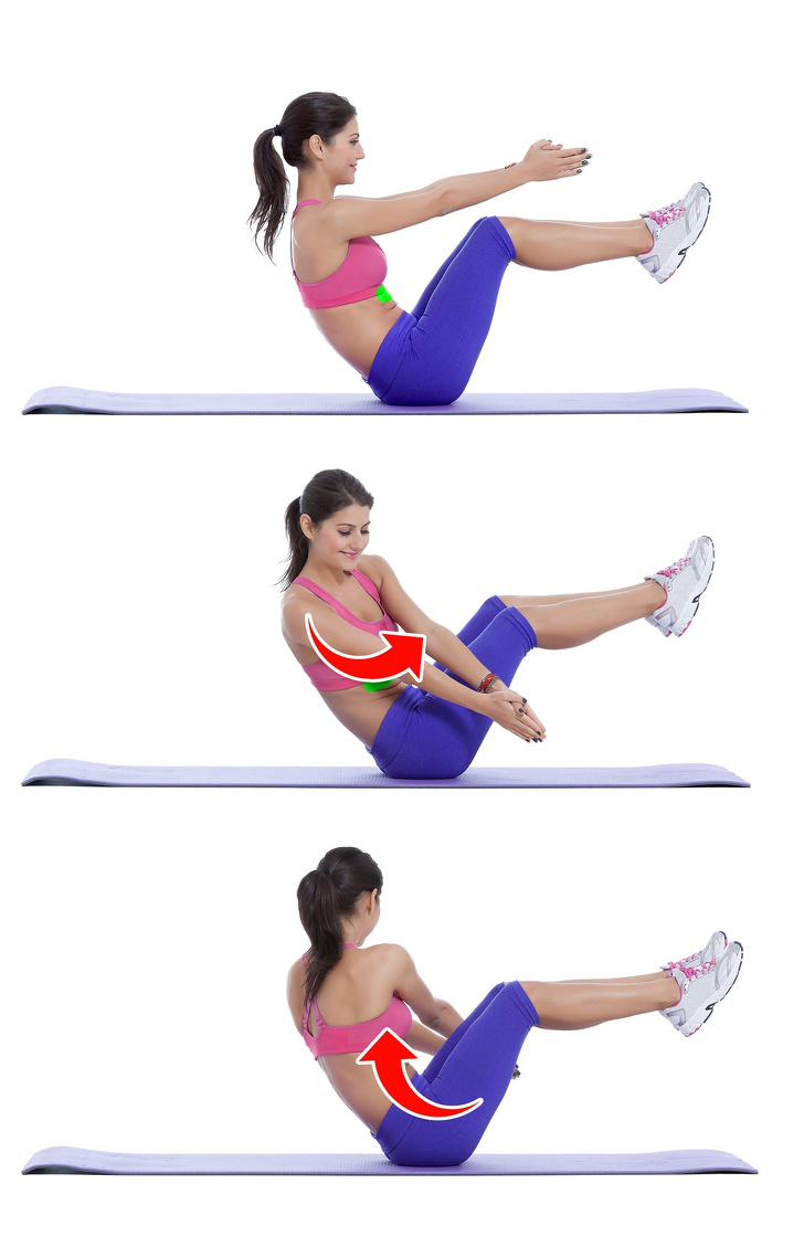 Vặn người khi nâng chân lên cao: 1-Ngồi trên sàn và nâng hai chân lên, bàn chân chụm vào nhau; lưng tạo với sàn một góc 45 độ. 2-Hai tay chụm vào nhau và đưa từ bên này sang bên kia theo hướng vặn người. Thực hiện một cách chậm rãi. 3-Không dừng lại giữa các lần tập bởi hiệu quả tác động tới bụng sẽ mất đi.