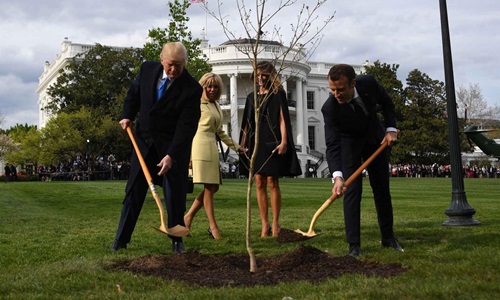 Trump (trái) và Macron trồng cây sồi trên bãi cỏ Nhà Trắng tháng 4/2018. Ảnh: AFP.