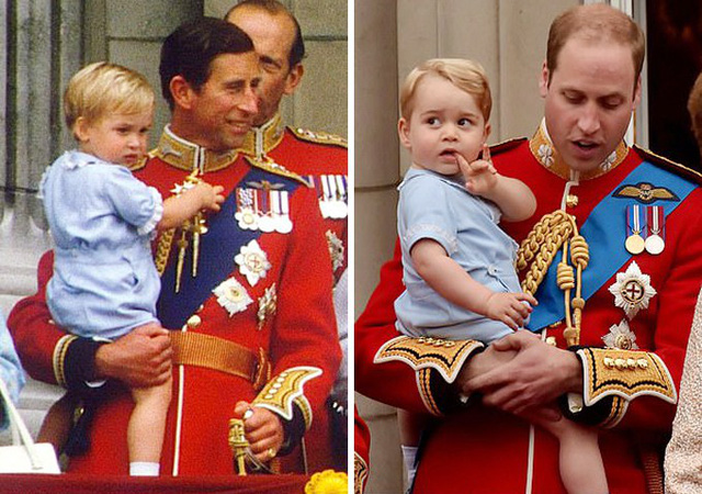 Thái tử Charles bế Hoàng tử William năm 1984 (trái) và Hoàng tử William bế Hoàng tử George năm 2015, cùng trên ban công Điện Buckingham nhân sinh nhật Nữ hoàng (phải). Ảnh: UK Press.