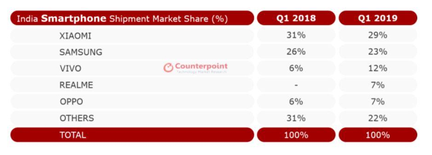 Trong số những cái tên xuất hiện trong báo cáo của Counterpoint Research, Realme được xem là cái tên đáng chú ý nhất. Thương hiệu này được thành lập vào năm 2018, nhưng đã nhanh chóng chiếm được 7% thị phần smartphone tại Ấn Độ ngay trong quý I/2019.