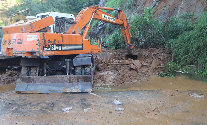 Lực lượng chức năng đã điều 5 xe múc tới hiện trường, giải phóng số đất đá đổ tràn xuống mặt đường.