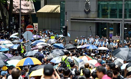 Hàng nghìn người mặc áo đen, đeo khẩu trang sáng nay tập trung bên ngoài tổng hành dinh sở cảnh sát Hong Kong trong cái nắng oi bức, hô khẩu hiệu đòi trả tự do cho những người biểu tình bị cảnh sát bắt trong cuộc đụng độ hồi tuần trước. Một số người biểu tình thậm chí gỡ bỏ rào chắn để tiến sâu vào khu vực trụ sở cảnh sát, bất chấp nỗ lực ngăn dòng người biểu tình của lực lượng này.
