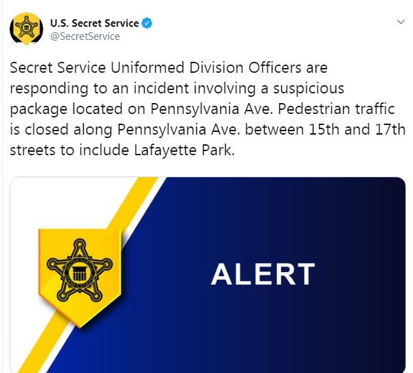 Đặc vụ Mỹ đăng tuyên bố lên Twitter vài phút sau, nói rằng cơ quan đang giải quyết trường hợp liên quan đến một bưu phẩm đáng ngờ ở phố Pennsylvania Ave. Các tuyến đường bộ gần đó cũng bị đóng cửa ngày 24/6, cơ quan cho biết.