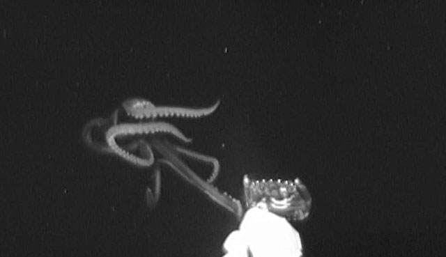 Một chiếc camera được đặt đưới dộ sâu gần 800m dưới biển. Các nhà nghiên cứu đã vô cùng mừng khi phát hiện một con mực khổng lồ lại gần camera. Chỉ vài giây xuất hiện, con mực đã nhanh chóng bơi đi.