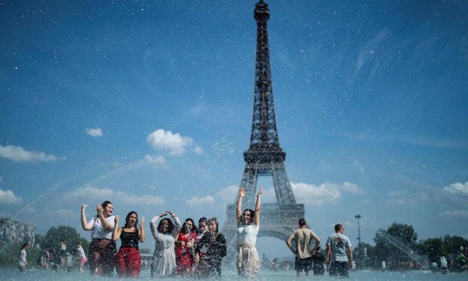 Người dân Paris giải nhiệt tại đài phun nước trong vườn Trocadero, dưới chân tháp Eiffel trong thời tiết nắng nóng ngày 25/6.