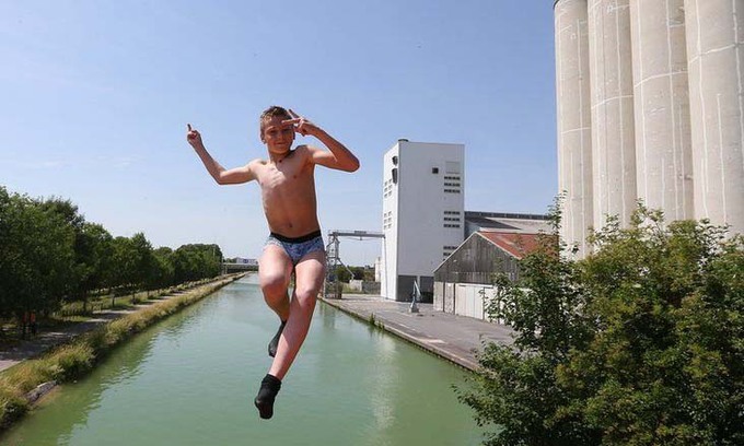 Một thiếu niên nhảy xuống con kênh gần Reims, đông bắc nước Pháp khi nền nhiệt tăng cao hôm 25/6.
