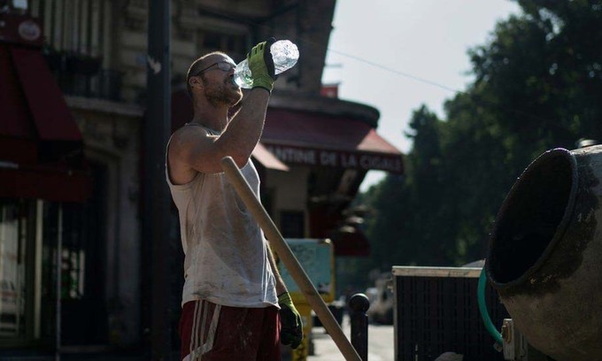 Một công nhân xây dựng ở Paris uống nước trong thời tiết nắng nóng. Cơ quan dự báo thời tiết các nước Bỉ, Czech, Pháp, Đức, Italy, Tây Ban Nha và Thụy Sĩ khuyên người dân nên tránh lao động nặng vào buổi trưa và buổi chiều, uống nhiều nước và tránh ánh nắng mặt trời trong những ngày nhiệt độ tăng cao.