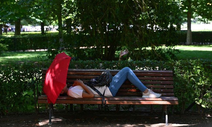 Người phụ nữ nằm nghỉ trên ghế trong công viên Retiro ở trung tâm thành phố Madrid, Tây Ban Nha ngày 25/6. Cơ quan thời tiết AEMET Tây Ban Nha cho biết đợt nắng nóng xuất hiện ở nước này từ ngày 25/6 và dự kiến kéo dài đến đầu tuần tới.