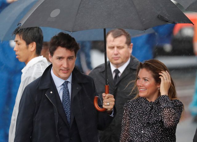 Thủ tướng Canada Justin Trudeau cầm ô che cho phu nhân Sophie khi bước xuống sân bay tại Osaka, Nhật Bản.