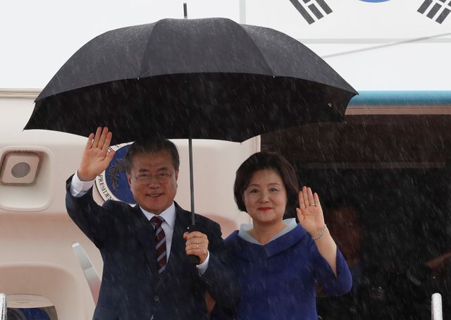 Tổng thống Hàn Quốc Moon Jae-in và phu nhân Kim Jung-sook vẫy tay chào khi bước xuống máy bay ở Osaka.