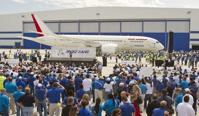 6.000 nhân viên nhà máy Boeing ở South Carolina đón chào chiếc 787 Dreamliner đầu tiên được lắp ráp và đi vào hoạt động ngày 27/4/2012. Ảnh: Seattle Times.