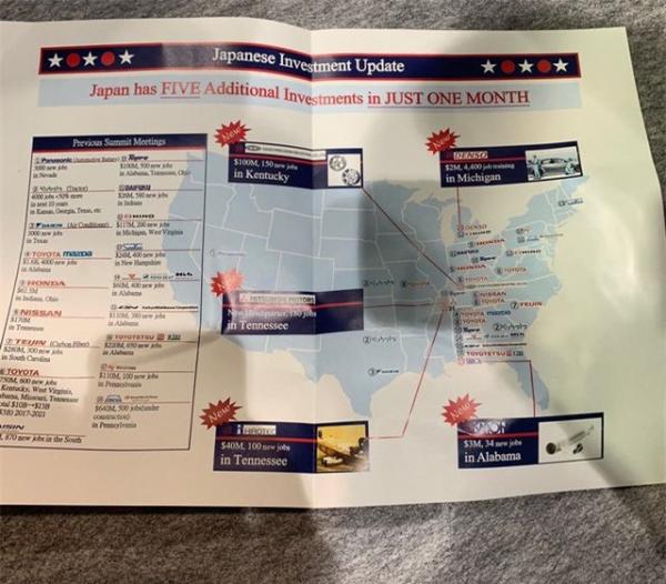 Thủ tướng Shinzo Abe đã sử dụng tấm bản đồ đặc biệt để giải thích cho Tổng thống Donald Trump các dự án đầu tư của Nhật Bản tại Mỹ. Điều này đã gây ấn tượng mạnh mẽ đối với ông Trump.