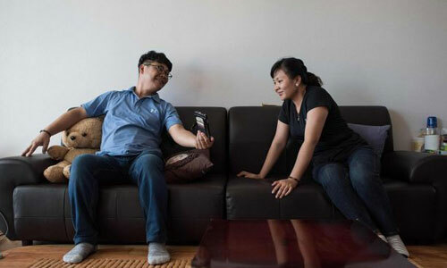 Chị Huynh Thi Thai Muoi, 23 tuổi, (trái) bên cạnh người chồng Hàn Quốc 43 tuổi Kim Kyeong-Bok trong căn hộ ở Gwangju hôm 23/8/2017. Ảnh: AFP.