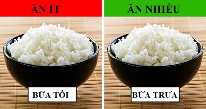 Cơm: Thực phẩm phổ biến này chứa rất nhiều carbohydrate phức tạp nên mất nhiều thời gian để tiêu hóa. Đó là điều tốt vì nó giúp cơ thể tràn đầy năng lượng trong thời gian dài. Cơm cũng chứa nhiều calo, có khả năng gây tăng cân nếu bạn ăn nhiều vào ban đêm. Bữa trưa là thời gian tốt nhất để ăn cơm. Quá trình trao đổi chất của cơ thể hoạt động nhanh vào thời điểm này và chúng dễ tiêu hóa hơn.