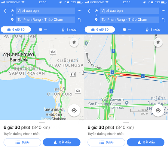 Khi quay ngược lại bản đồ, bạn sẽ thấy những đoạn đường được tô màu xanh lá (thông thoáng), cam (ùn tắc nhẹ) và đỏ (kẹt xe nặng) hoặc những con đường đang bị chặn. Từ đó, người dùng có thể thay đổi lộ trình di chuyển cho phù hợp.
