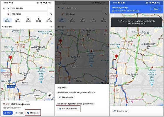 Tính năng này đặc biệt hữu ích ở những thành phố bạn mới đến, Google Maps sẽ gửi thông báo tới điện thoại nếu phát hiện lộ trình đang di chuyển xa hơn 500 mét so với lộ trình ban đầu.