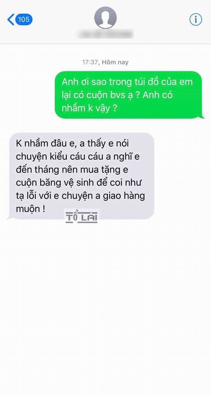 Tao nhắn tin hỏi anh shipper thì anh ý bảo là chắc tao đến tháng nên khó chịu, anh ý mua cuộn băng vệ sinh tặng tao coi như là chuộc lỗi đi muộn. Mà cái đcm phải công nhận là ông anh này tài tình dã man, chả hiểu sao biết luôn là mình đến tháng mới hay chứ.