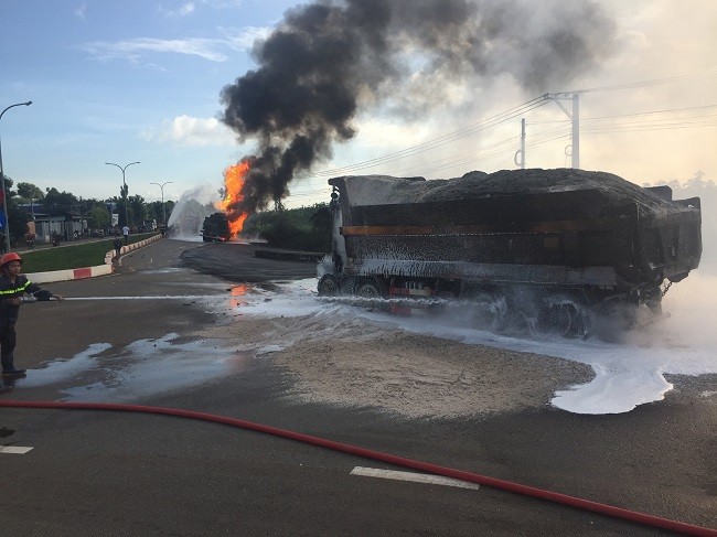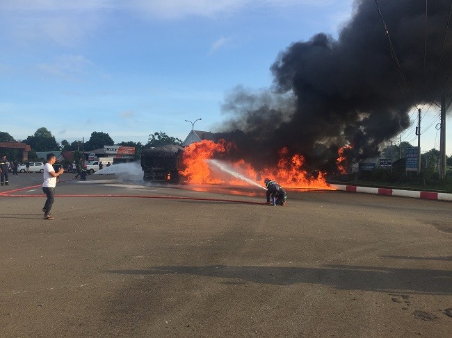 Sau khi xảy ra vụ tai nạn, khoảng 5 chiếc xe cứu hỏa được điều đến hiện trường phối hợp dập tắt đám cháy ngùn ngụt. Đến khoảng 1 giờ sau, đám cháy mới cơ bản được dập tắt trên xe tải, còn xe bồn do lượng xăng dầu lớn nên vẫn đang bốc cháy dữ dội.