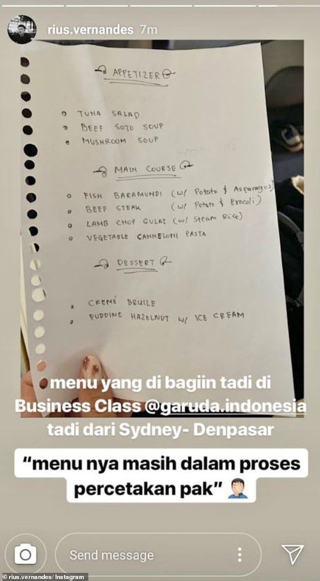Anh chia sẻ lên trang các nhân h́nh ảnh về thực đơn trên chuyến bay của hăng hàng không quốc gia Garuda, Indoneisa. Đó là một mẩu giấy được viết tay. Kèm theo h́nh ảnh, nam blogger chú thích với nội dung mỉa mai: “Thưa ngài, thực đơn vẫn đang được in”.
