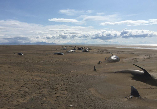 60 con cá voi đầu tròn vây dài nằm chết cạnh nhau trên một bãi biển hoang vắng ở Iceland. Chúng được phát hiện bởi khách du lịch đi tham quan bằng trực thăng.