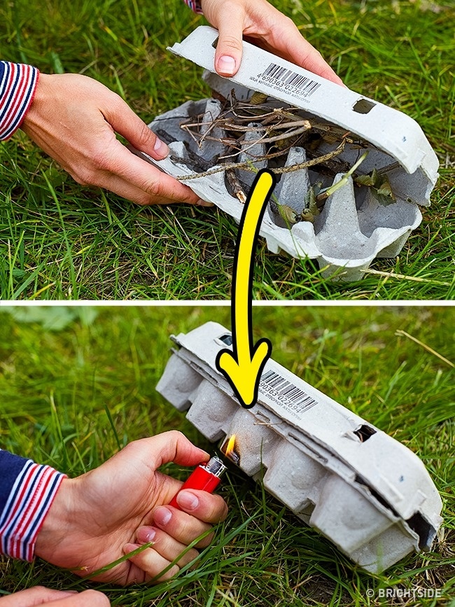 Để nhóm lửa nhanh chóng hãy đặt cành cây hoặc than vào một hộp trứng rỗng. Sau đó, đốt cháy hộp trứng và lửa sẽ bén vào cành cây tốt hơn, ngay cả trong thời tiết mưa gió.