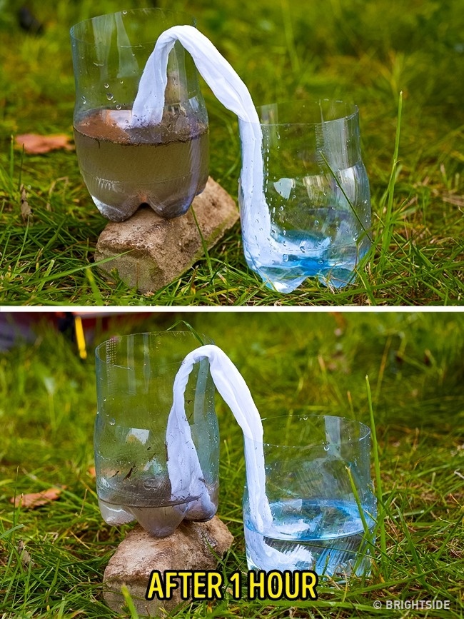 Đặt một chai nước bẩn trên một bề mặt ở vị trí cao hơn và ngay bên dưới đặt chai/thùng rỗng để hứng nước sạch. Xé một mảnh vải và đặt một đầu vào chai nước bẩn, đầu kia ở trong chiếc chai rỗng. Sau khoảng 1 giờ bạn sẽ thu được nước sạch ở chai rỗng.