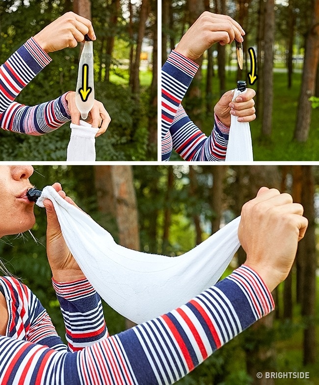 Một bao cao su luôn vô trùng và khá dai. Trong một tình khẩn cấp, nó có thể được sử dụng để lưu trữ nước tinh khiết. Gắn một ống nhỏ vào miệng bao cao su, đổ một ít nước vào bao cao su và đặt nó vào một chiếc tất. Bạn sẽ có một đồ chứa được 1 lít nước.