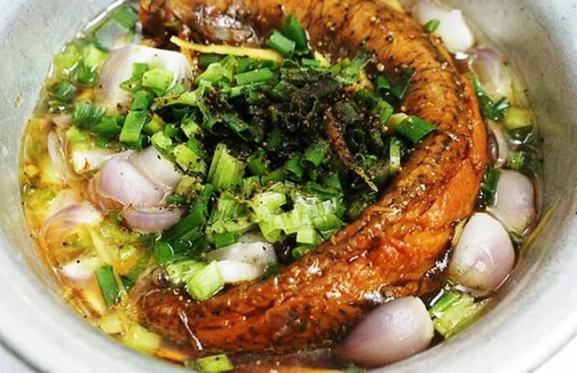 Mắm cá lóc chưng dừa sử dụng gia vị tiêu, hành, tỏi, ớt... cùng với nước cốt dừa và được chưng cách thủy. Món ngon này thường được ăn kèm với chuối chát, rau sống hay khế chua ngon đúng điệu, rất đưa cơm. Không chỉ được chưng với mắm cá lóc, bà con miền Tây vào mùa mưa còn dùng các loại cá khô chưng nước dừa trong bữa cơm hằng ngày.