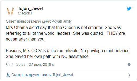 Bà Obama không nói là Nữ hoàng không thông minh; bà ấy đề cập tới tất cả các nhà lãnh đạo thế giới. Bà nói: Họ không thông minh hơn các bạn. Ngoài ra hồ sơ cá nhân của bà Obama rất ấn tượng: không thừa kế, không nhận được ưu tiên. Bà tự tạo ra con đường của riêng mình mà KHÔNG có sự trợ giúp.