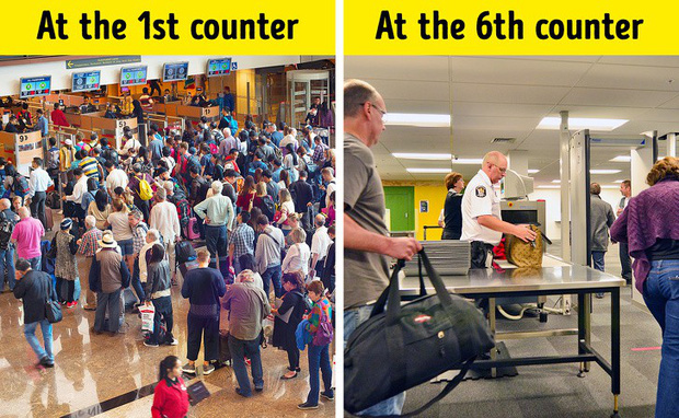 Thông thường, du khách có xu hướng nhập vào 2 hàng kiểm tra an ninh đầu tiên, và thường phải chờ đợi rất lâu. Thay vì vậy, hãy cố tản ra những hàng ở xa hơn để vắng bớt người. Ngoài ra tại cửa kiểm tra an ninh, du khách thường bỏ những vật dụng như trang sức, đồ dùng kim loại ở dưới cùng của hành lý xách tay và chồng quần áo lên trên, khi kiểm tra sẽ gặp rắc rối. Đặc biệt, du khách cũng nên giữ thái độ nghiêm túc khi qua cửa an ninh.