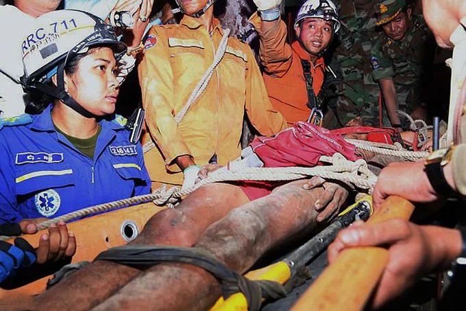 Một người đàn ông Campuchia 28 tuổi nằm giữa hai phiến đá trong khi đi thu thập phân dơi, khiến ngay sau đó, khoảng 200 nhân viên cứu hộ đă cẩn thận giải cứu người đàn ông mắc kẹt bằng cách phá dần các tảng đá bao quanh Sum mất 10 tiếng mới giải cứu được người đàn ông này.