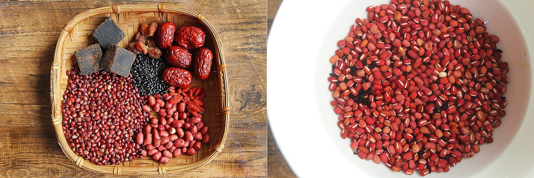 Lạc rửa sạch, cũng ngâm trong nước nhưng ngâm không quá lâu. Cho đậu đỏ, lạc, gạo đen, nhãn, táo tàu vào nồi. Đổ cả nước ngâm lạc vào.