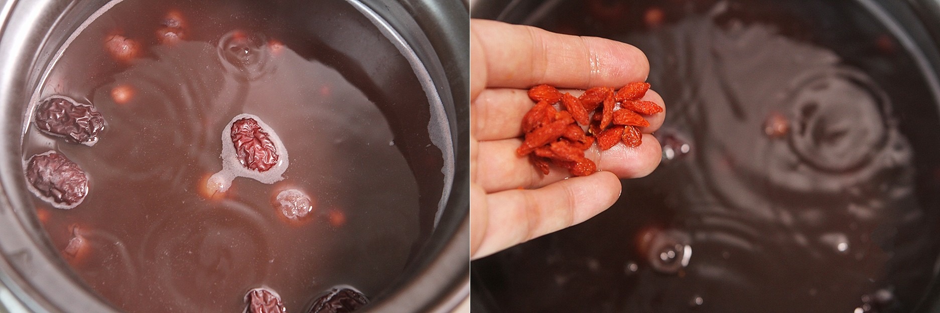 Thêm lượng nước gấp 4 lần nguyên liệu vào nồi, đun sôi rồi hạ nhỏ lửa đun trong 80 phút. Sau đó thêm kỷ tử vào đun thêm 10 phút nữa.