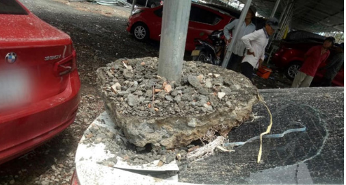 Kèm theo đó là những hình ảnh được chụp lại với cảnh khung sườn và mái che ở bải xe bị bật tung, nhiều mái tôn bị văng đi mất, các khung sắt nằm ngổn ngang. Nhiều ô tô đang đậu trong bãi bị, móp méo, hư hại.