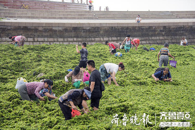 Theo đó, trên khắp một dải bờ biển tại đây, một lượng rong biển vô cùng lớn đã được bão cuốn theo vào bờ. Người dân địa phương sau khi biết có hiện tượng này đã bảo nhau ra đây nhặt về làm thực phẩm.