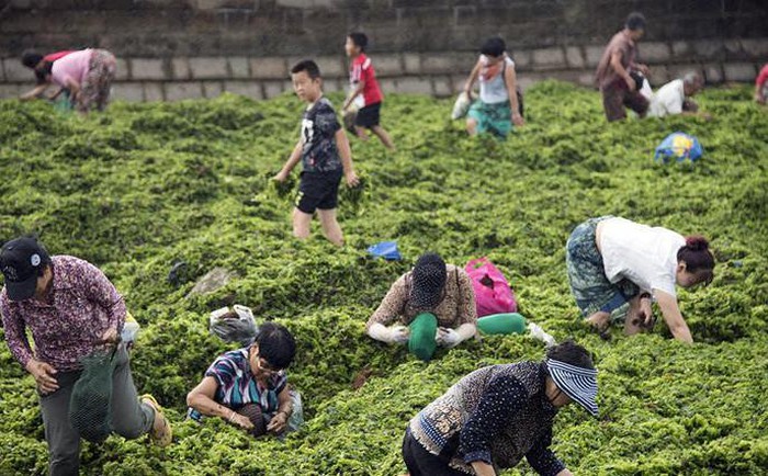 Theo đó, trên khắp một dải bờ biển tại đây, một lượng rong biển vô cùng lớn đã được bão cuốn theo vào bờ. Người dân địa phương sau khi biết có hiện tượng này đã bảo nhau ra đây nhặt về làm thực phẩm.