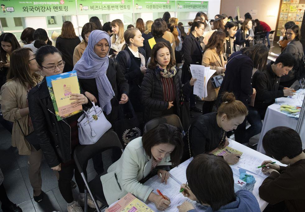 Các cô dâu ngoại quốc đang dự một hội chợ việc làm ở Seoul ngày 5/4. Ảnh: Yonhap.