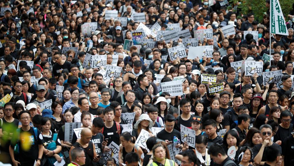 Vào buổi chiều, số người tham gia tuần hành ngày càng đông. Người biểu tình giương cao biểu ngữ : « Cảnh sát Hồng Kông biết luật, cảnh sát Hồng Kông vi phạm pháp luật ». Một nhà giáo về hưu tên là Lee phát biểu với hãng tin Anh Reuters : « Nếu bà Carrie Lam dũng cảm đáp ứng các nguyện vọng của chúng tôi ngay từ đầu, thì đã không có ai bị thương ».