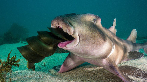 Một con cá mập sừng mào đang ăn trứng của loài cá mập khác – Ảnh: PETE MCGEE