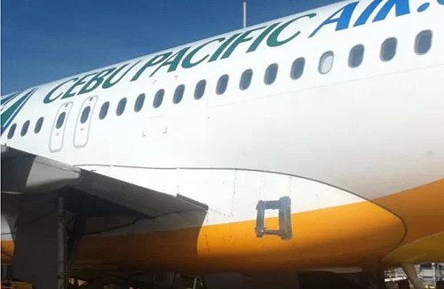 Một chiếc Airbus A320 của hãng Cebu Pacific đã được dán băng dính trên thân. Ảnh: Facebook.