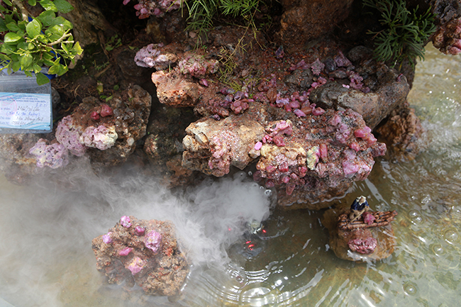 Trong non bộ được lắp ráp máy bơm nước và máy tạo khói để người xem cảm nhận xung quanh mặt nước có một lớp sương mờ ảo