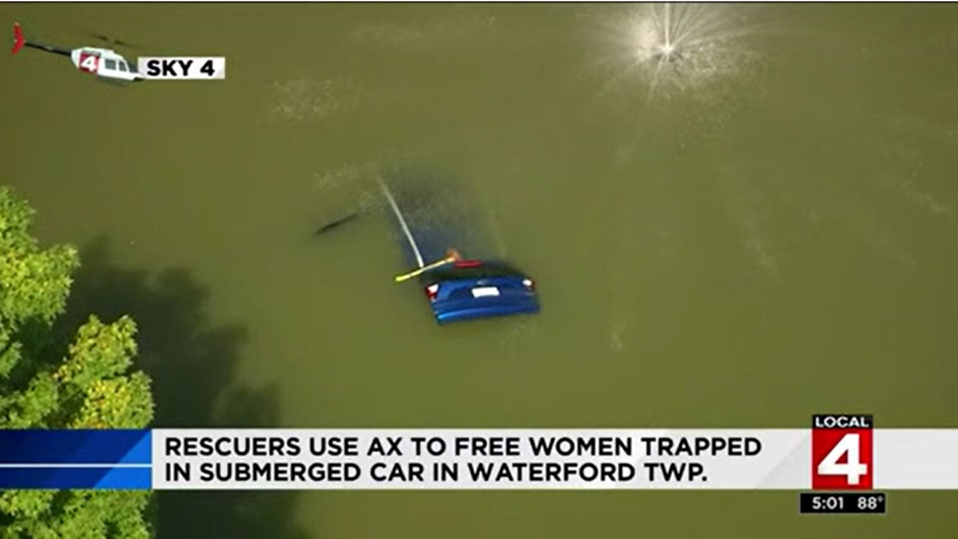 Lính cứu hỏa phải dùng rìu phá kính đưa người trong xe ra ngoài. (Hình: WDIV-TV)