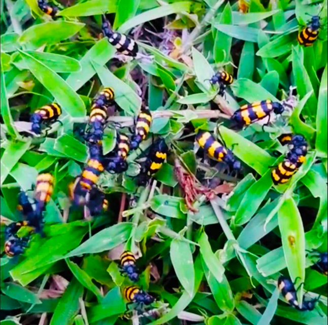 Những con bọ 3 sọc vàng xuất hiện nhiều trên các bãi cỏ ở huyện Đăk Tô.