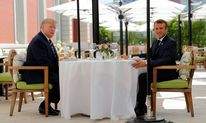Tổng thống Pháp đãi Trump bữa trưa bất ngờ. Việc này không nằm trong lịch trình trước khi G7 khai mạc. Tổng thống Pháp và người đồng cấp Mỹ đã có bữa trưa vui vẻ ở tầng thượng khách sạn Hotel du Palais.