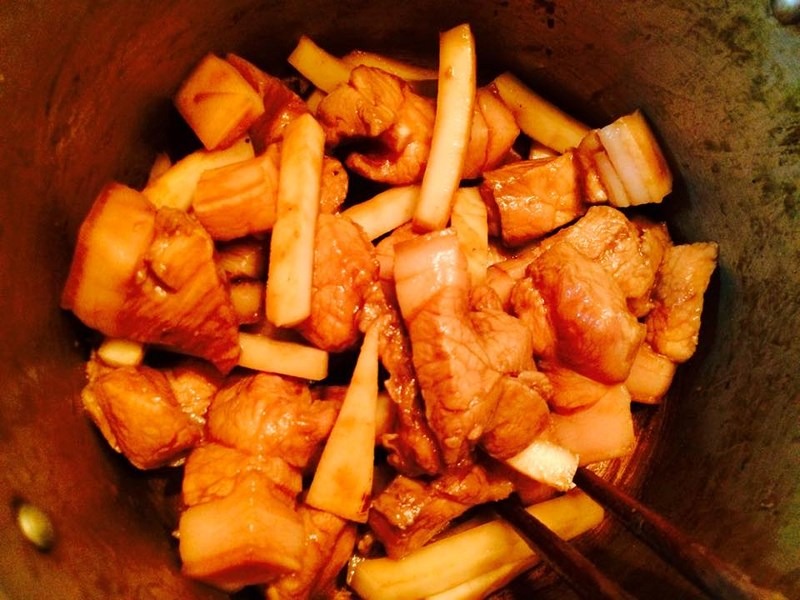 Khi món ăn sôi thì để lửa nhỏ, đậy vung và kho cho nguyên liệu chín mềm, nước thịt cạn bớt và có độ sánh đặc thì tắt bếp. Món này thưởng thức với cơm nóng kèm dưa chua thì ngon phải biết.