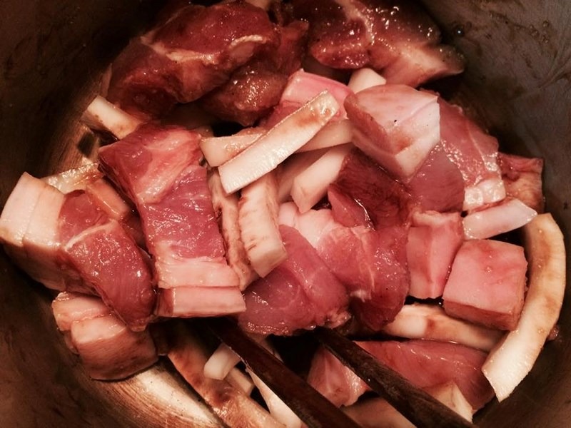Cho thịt vào nồi cùng với muối, bột ngọt, tiêu, nước màu rồi đảo đều và ướp thịt 30 phút cho ngấm gia vị.