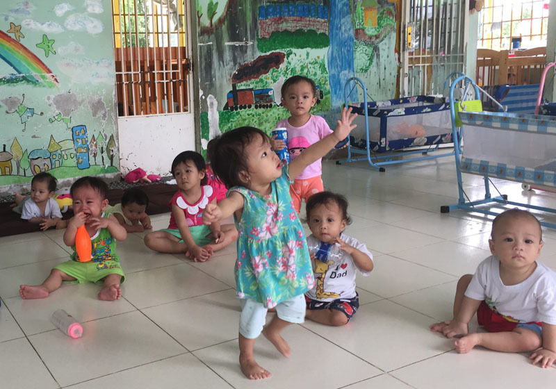 Vừa bước vào cơ sở bảo trợ trẻ em Thiên Thần, một đám trẻ ùa đến, giơ tay xin được bế khiến chúng tôi không thể cầm lòng.