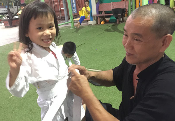 Ông Hiệp mặc áo cho con gái khi bé đi học võ. Ảnh: Trần Chánh Nghĩa.