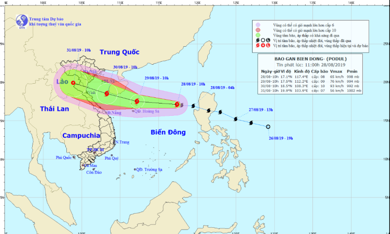 Dự báo trong 24 giờ tới, bão di chuyển theo hướng tây, mỗi giờ đi được khoảng 25km và có khả năng mạnh thêm. Đến 10 giờ ngày 29-8, vị trí tâm bão ở khoảng 17,5 độ Vĩ Bắc; 112,2 độ Kinh Đông, ngay trên vùng biển quần đảo Hoàng Sa. Sức gió mạnh nhất vùng gần tâm bão mạnh cấp 8-9 (60-90km/giờ), giật cấp 11.