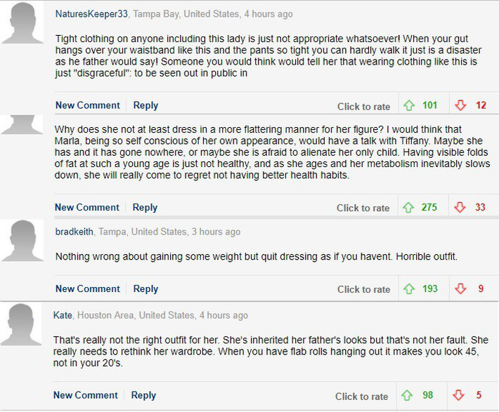 Nhiều bình luận chỉ trích gu thời trang của Tiffany Trump: Quần áo bó sát không hề hợp với cô ấy. Chiếc quần quá chật không chỉ khó đi lại mà còn khiến hình ảnh kém duyên/ Sao cô ấy không thử đổi style với những bộ cánh tôn dáng hơn/ Béo không đáng xấu hổ nhưng hãy dừng ngay việc ăn mặc thảm họa thế này lại. Quá tệ/ Bộ cánh này không hợp với cô ấy chút nào